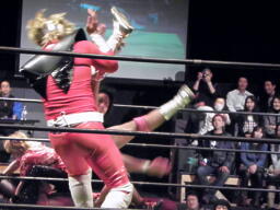 HARASHIMAはだったら、と蒼魔刀ではなくバズソーキック(右写真)でカウント3。HARASHIMAは優しいなあ(違)。
