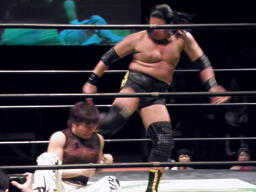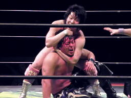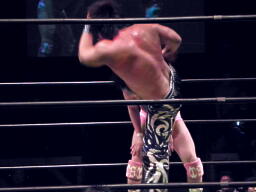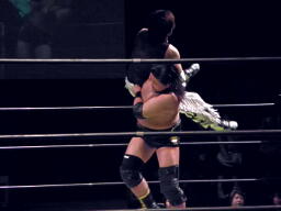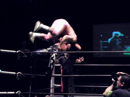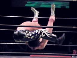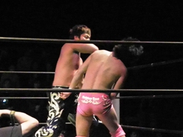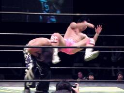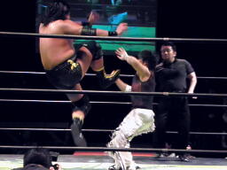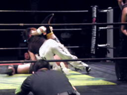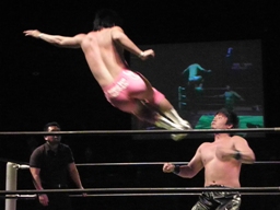 コーナーに上ってダイビングボディプレス(右写真)、カウント2。