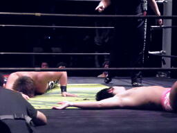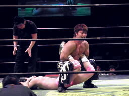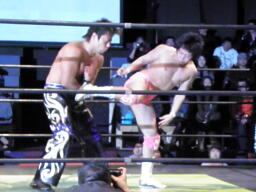 しかし蒼魔刀はかわし石井投げっ放しジャーマン、両者ダウン(右写真)。