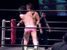 石井いきなり首固め、カウント2。HARASHIMAヒザ蹴り、コーナーに振って串刺しビッグブーツ(左写真)。
