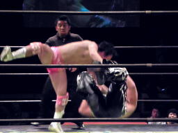 MIKAMIキャッチ延髄はかわされるがバックキックをヒット(左写真)。