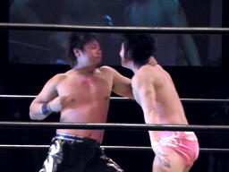 再びエルボー打ち合い(左写真)、HARASHIMAビッグブーツ。