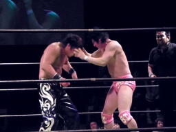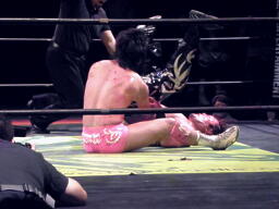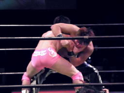 HARASHIMAキャメルクラッチ(右写真)、石井なんとかロープエスケープ。