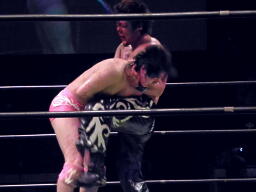 石井デンジャラスエクスプロイダー狙う(右写真)、こらえるHARASHIMAの顔面からは血がボタボタとマットに。