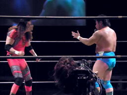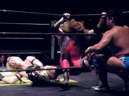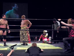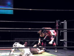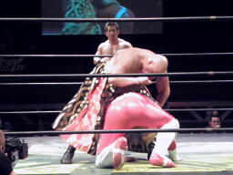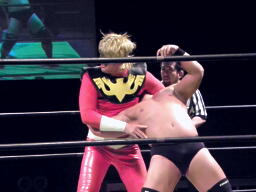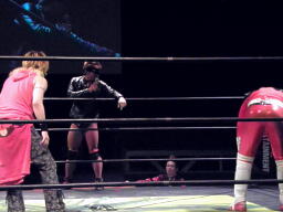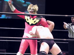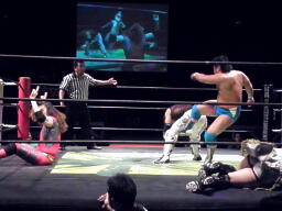 MIKAMIはスワンダイブでポイズンにチョップ、コーナーに松永にジャンピングニーアタック。MIKAMIはポイズンにフェースカット、鳥羽を呼び込んでミカトバラッシュ狙う、ポイズン呪文、Suicide Boyzの動きが止まる、松永が入ってキック(左写真)。