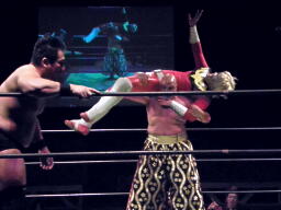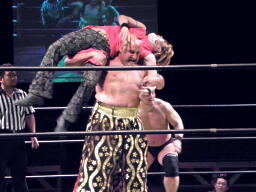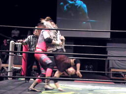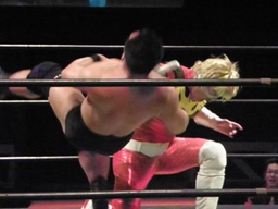 ポイズンと松永が先制攻撃、MIKAMIを場外に落とすと鳥羽にダブルのショルダーブロック、松永が鳥羽にバックドロップ(右写真)、カバーはMIKAMIがカット。