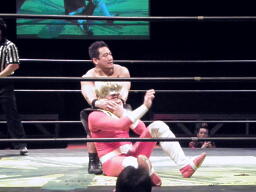 松永レッグブリーカー、ヒザを引っ張る。場外に出すとポイズンがストンピング、鉄柱攻撃、イス攻撃。リングに戻す。松永サッカーボールキックから片エビ固め、2で返されるとそのまま抱え込み式逆片エビ固め(右写真)、鳥羽ロープ。松永はポイズンにタッチ。