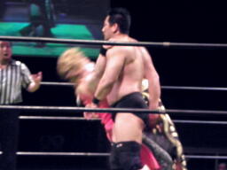 星誕期ボディスラム、背中にパンチ(右写真)。高木にタッチ。