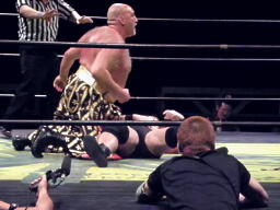 ポイズン蛇界ノクラズム(右写真)。ポイズン「決まったー!」と喜ぶ。そういえばいつもこの体勢には入るが決まったことはなかった気がする。ポイズンは松永にタッチ。
