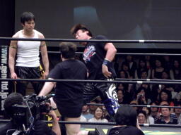高木「俺を関本だと思って打ってみろ!」とマットに座る。HARASHIMA高木に蒼魔刀(右写真)