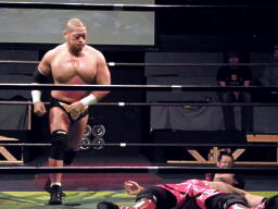 東郷首投げからフィストドロップ(左写真)、カウント2。