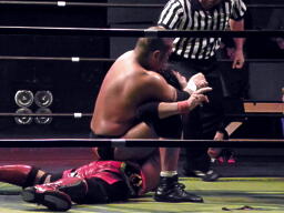 安部ドロップキックで先制、スクールボーイ、カウント2。回転エビ固め(右写真)、カウント2。首固め、カウント2。