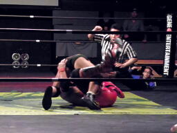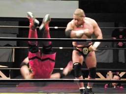 安部もう一発ボディスラム狙う、東郷は首固め(右写真)、カウント2。