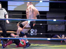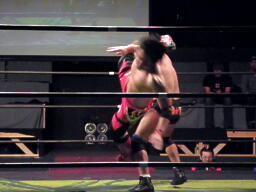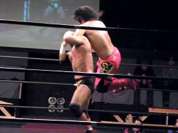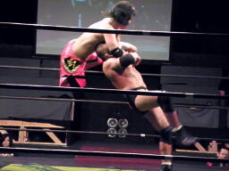 東郷エルボースタッブ、ロープに振る、安部ドロップキック、東郷スカす。東郷ロープに飛ぶ、安部前転からドロップキック(左写真)。