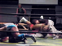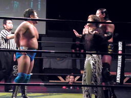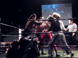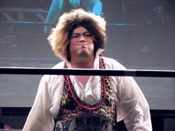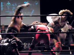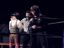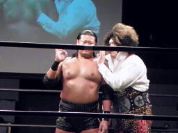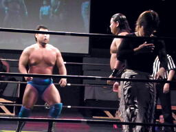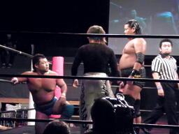 MIKAMI戻って3人でチョップの打ち合い、松永不利を察し「僕は3番目でいいですから。」大鷲との共闘を申し入れる(右写真)。大鷲合意。