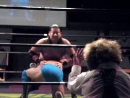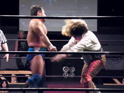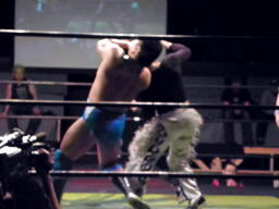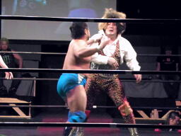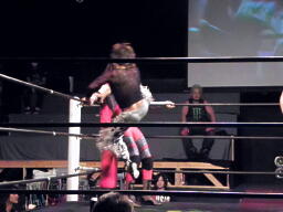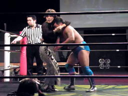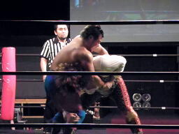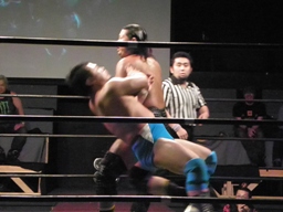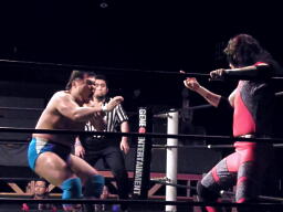坂井の作戦が失敗に終わり空気が微妙になったところでMIKAMIと松永で再開。MIKAMIヘッドロック(左写真)、松永ロープに振る、MIKAMIショルダーブロック。松永「効かねえよ!」MIKAMIロープに飛んでもう一回ショルダーブロック。松永「効かねえよ!」