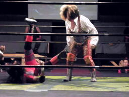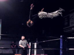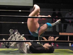 大鷲ボディスラム、松永エルボードロップ(右写真)、「どうぞどうぞ」大鷲カバー、カウント2。