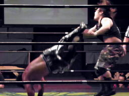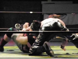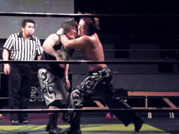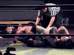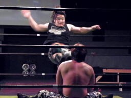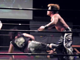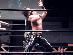 HARASHIMAがロープをまたぐ際にロープを蹴り上げる。さらにマンハッタンドロップ(左写真)。
