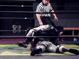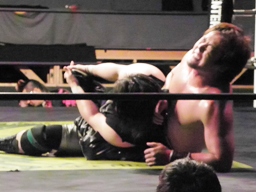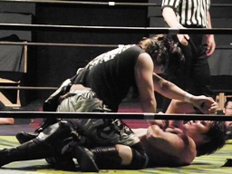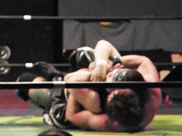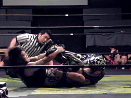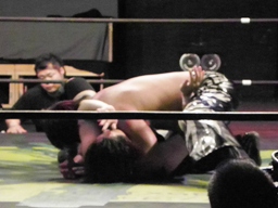 ウラノツームストーン狙うがHARASHIMAはブロックして肩に担ぐ、ウラノ背後に着地してスリーパー(左写真)。