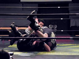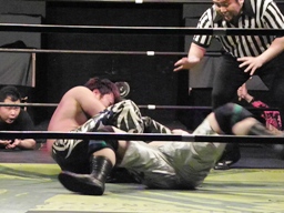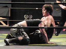 ウラノ首固め(右写真)、カウント2、HARASHIMA切り返す、カウント2。