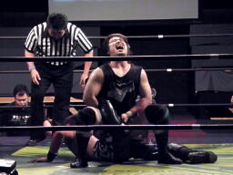 ウラノレッグロック(右写真)、HARASHIMA思わず「痛たたっ!」ロープエスケープ。