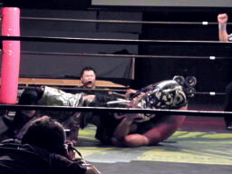 HARASHIMAカウント2で返して腕を伸ばす(左写真)、ウラノギブアップ。