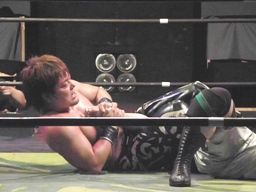 ボディスラムに行くがウラノは丸め込んでアンクルホールド(左写真)、HARASHIMAロープ。