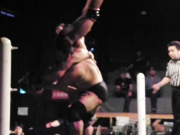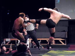 高木のスタナーをブロックしてマイケルがスタナー(右写真)、トラースキックで落とす。テーブル破壊。2−1に。