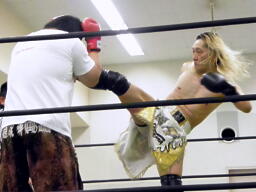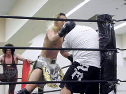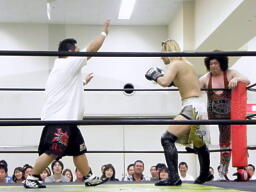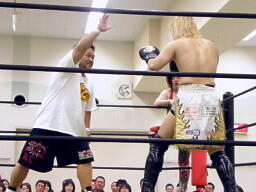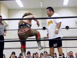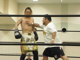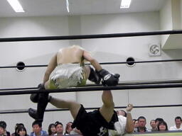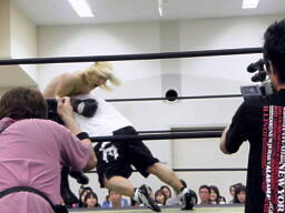 高森もローキックで返す(右写真)。鳥羽は場外エスケープ。