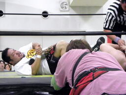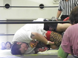 しかし鬼木あっさり倒してマウントポジション。坂井「乗るな!」鬼木無視して十字(右写真)、坂井タップ、しかしそれをごまかすように鳥羽がカット。
