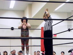 鬼木が坂井をラ・マヒストラル、高森が鳥羽を外道クラッチで同時フォール(左写真)、3カウント。