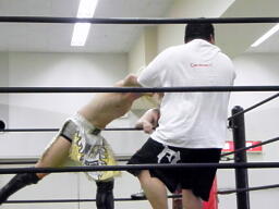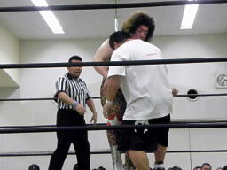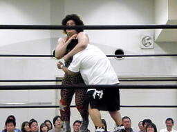 坂井「さっきのは初犯ということで目をつぶりましょう。今度やったらコレですから。ここからはプロレスの技術で。」(左写真)5分経過。