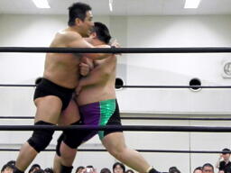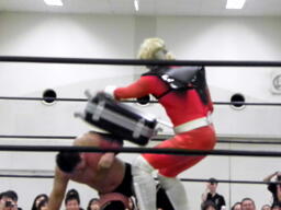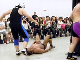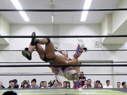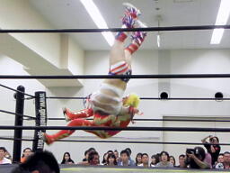 多摩川がアステカをリングに戻しニードロップ、コーナーに振ってジェットストリームアタック、アステカかわし3人にラリアット。アステカが多摩川に垂直落下式ブレーンバスター(右写真)。