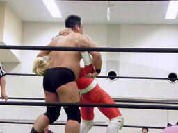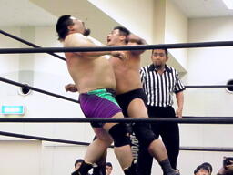 ショルダーブロックの打ち合い(左写真)、高木クローズライン、ブルーとかわしてショルダーブロックで倒す。
