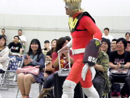 「シャアが来る」が流れ、ヤゴウ・アズナブルがキャリーケースを引いてリングに(右写真)。