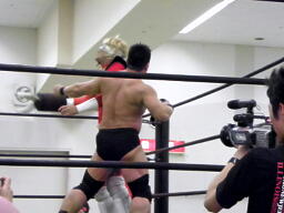 ヤゴウにジャブロー決める(右写真)、しかしブルートが松井レフェリーの足を引っ張って場外に出しカウント阻止。