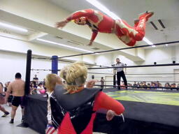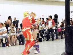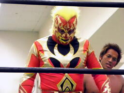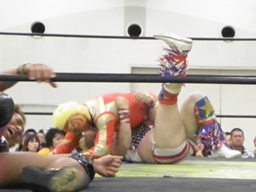 トリプルドロップキックでヤゴウらを場外に落とすとアステカがプランチャ(左写真)。