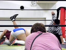 ついにフォールの体勢(右写真)、カウントは2。