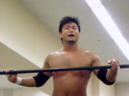 澤「ギブアップさせるしかないっ!」とスリーパー、さらに腹固めからワキ固め(右写真)。ディーノロープ。