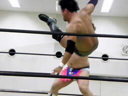 澤コーナーからダイブ、ディーノはその股間をキャッチ(右写真)、男色スクリューに。