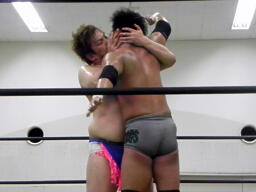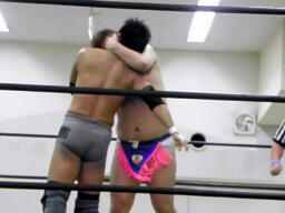澤「しょーがねえっ!」と意を決してキスに、ディーノは唇を付けたまま首固めの要領で丸め込み(左写真)3カウント。