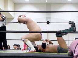 フォールの体勢に入るが「できねーっ!」(左写真)