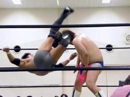 ディーノキスに行くが澤はブロック(左写真)。ディーノキック、澤キャッチしてドラゴンスクリュー。