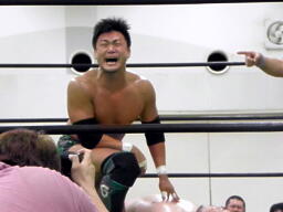 ディーノは握手と見せかけてキス(左写真)、カウント2。澤は場外エスケープ。