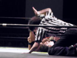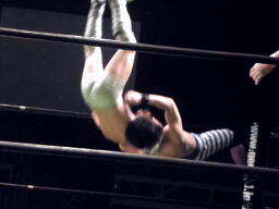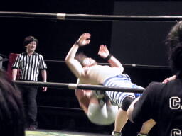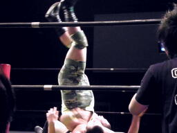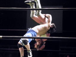 関根ミドルキック、入江キャッチして肩に担ぐと垂直落下(自分が)式バックフリップ(左写真)。そのジャンプ力で評価の高かった入江のバックフリップだが、これは自分がキツいだろ。カバーはカウント2。