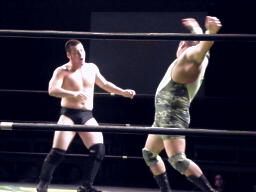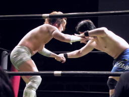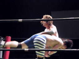 彰人水車落とし狙う、背後に着地してバックスタバー(左写真)。高尾コーナーに振って串刺しエルボー、ロープに飛んでランニングエルボー、カウント2。