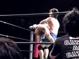 高尾コーナーに上る、彰人雪崩式ブレーンバスター(右写真)。
