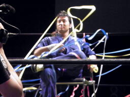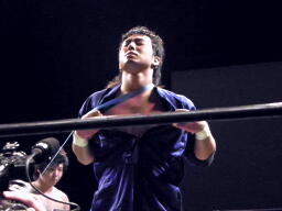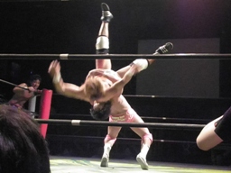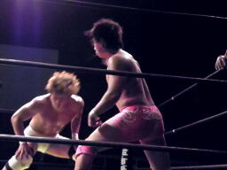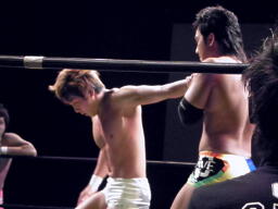 佐々木ブレーンバスター(左写真)、カウント2。佐藤にタッチ。10分経過。