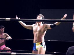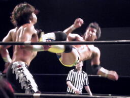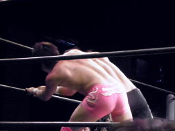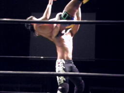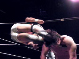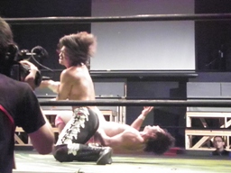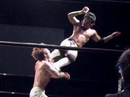 佐藤ダイビングフットスタンプ、石井かわしてニールキック、佐藤かわしてSEXボンバー、カウント2。佐々木エルボードロップ(右写真)、