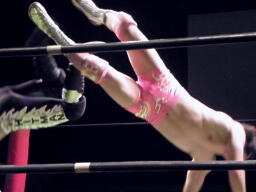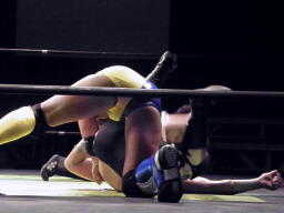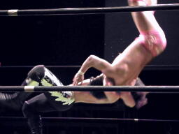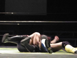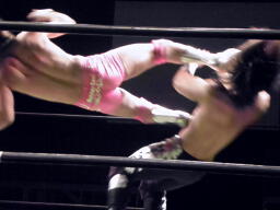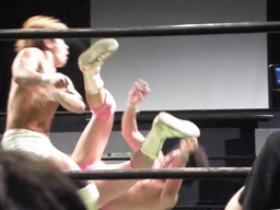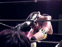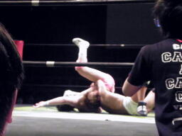 佐々木ロープに飛ぶ、安部トラースキック、ロープに飛んでウィッチブレイド、カウント2。安部スクールボーイ(右写真)、カウント2。石井にタッチ。